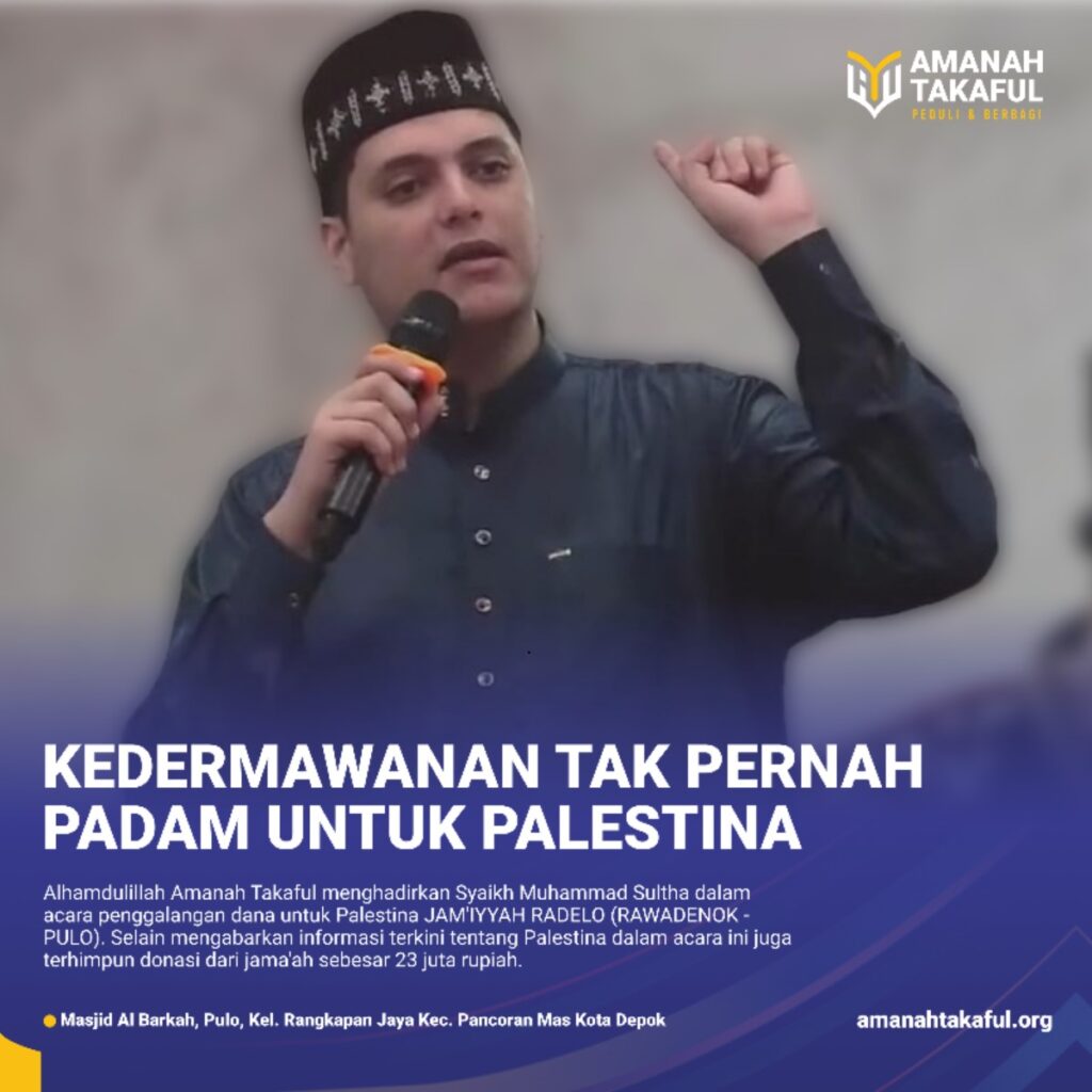 Amanah Takaful masih terus menggelar kegiatan safari syekh Palestina, kali ini kegiatan tersebut dilaksanakan di Masjid Al Barkah, Pulo, Kelurahan Rangkapan Jaya, Kecamatan Pancoran Mas, Kota Depok pada Ahad pagi (21/01). Amanah Takaful menghadirkan Syaikh Muhammad Sultha dalam acara penggalangan dana untuk Palestina Jami’yah Radelo (Rawadenok –Pulo). Selain mengabarkan informasi terkini tentang Palestina dalam acara ini juga terhimpun donasi dari jama’ah sebesar 23 juta rupiah. Dana yang terkumpul diharapkan dapat membantu Palestina yang terus mengalami penindasan dari Israel. Amanah Takaful, melalui kegiatan ini, menunjukkan komitmennya dalam mendukung kemanusiaan dan mengajak masyarakat untuk bersama-sama peduli terhadap nasib saudara-saudara kita di Palestina. Keberhasilan acara ini tidak hanya terletak pada jumlah donasi yang terkumpul, tetapi juga pada kesadaran masyarakat akan pentingnya memberikan dukungan dalam situasi krisis kemanusiaan di Palestina. Amanah Takaful mengucapkan terimakasih untuk para donator Jami’yah Radelo (Rawadenok – Pulo). Semoga inisiatif semacam ini dapat menjadi wujud kegiatan positif dalam membantu masyarakat Palestina dan semoga kepedulian terhadap Palestina terus terjaga, karena kedermaan sahabat bisa memperkokoh bahu masyarakat Palestina dari kedzholiman Israel.