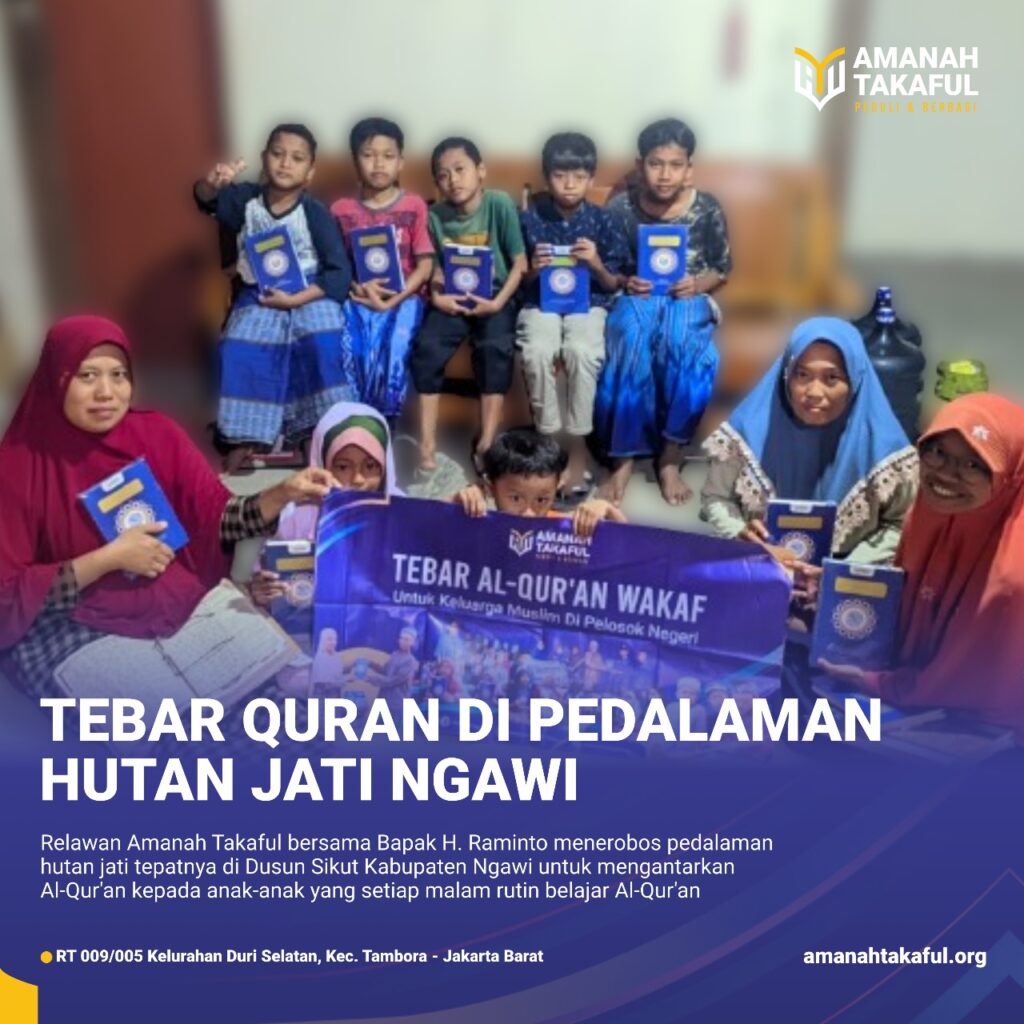 Pada Sabtu, 20 Januari 2024, relawan Amanah Takaful bersama Bapak H. Raminto melakukan kegiatan tebar Al-Qur’an di pedalaman hutan jati, khususnya di Dusun Sikut, Kabupaten Ngawi, Jawa Timur. Mereka mengantarkan Al-Qur’an kepada anak-anak yang secara rutin belajar Al-Qur’an setiap malam di daerah tersebut. Inisiatif tebar Al-Qur’an di pedalaman hutan jati menunjukkan komitmen Amanah Takaful dan relawannya dalam menjangkau masyarakat di daerah terpencil untuk mendukung pembelajaran Al-Qur’an. Bapak H. Raminto dan tim relawan berharap melalui kegiatan ini, diharapkan pengetahuan agama dan kecintaan pada Al-Qur’an semakin tersebar di kalangan anak-anak di pedalaman hutan jati. Kegiatan tebar Al-Qur’an ini menjadi bukti bahwa kebaikan bisa diwujudkan di tempat-tempat yang mungkin terabaikan.