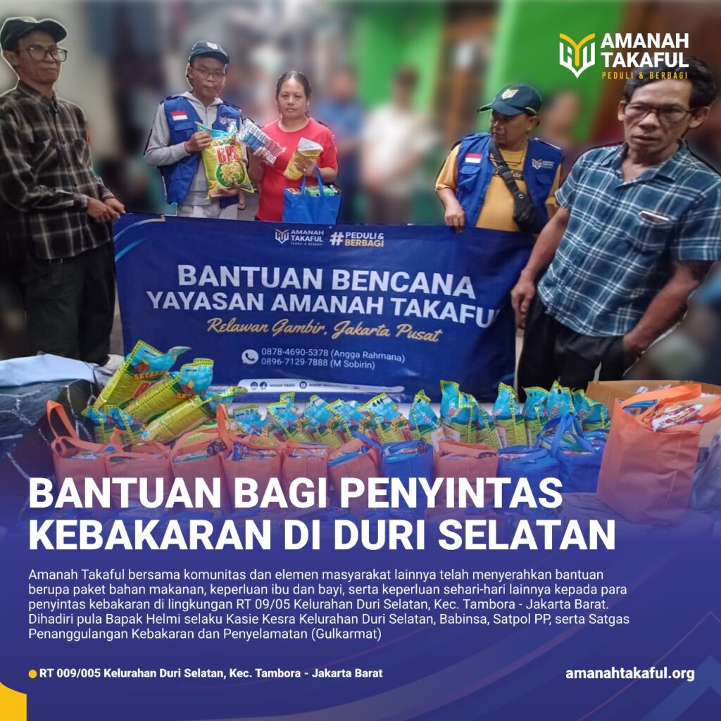 Musibah kebakaran kembali terjadi di pemukiman padat penduduk di kawasan Duri Selatan pada 6 Januari 2024, Kecamatan Tambora Jakarta Barat. akibatnya 80 rumah petak/kontrakan dan 11 rumah tinggal ludes terbakar dan sebanyak 56 Kepala Keluarga (KK) atau 141 jiwa terpaksa mengungsi. Beruntung tidak ada korban jiwa dalam musibah yang diduga akibat korsleting listrik ini. Pada Jumat, 19 Januari 2024, Amanah Takaful bersama komunitas dan elemen masyarakat lainnya merespon musibah tersebut dengan memberikan bantuan untuk para penyintas kebakaran yang masih mengungsi di tend darurat di RT 09/05 Kelurahan Duri Selatan, Kecamatan Tambora, Jakarta Barat. Bantuan yang diberikan berupa paket bahan makanan, keperluan ibu dan bayi, serta keperluan sehari-hari yang diserahkan langsung kepada para penyintas disaksikan Bapak Helmi selaku Kasie Kesra Kelurahan Duri Selatan, Babinsa, Satpol PP, serta Satgas Penanggulangan Kebakaran dan Penyelamatan (Gulkarmat). Bantuan yang diberikan bukan hanya sebagai bentuk kepedulian Amanah Takaful, melainkan juga sebagai upaya bersama untuk membantu mengurangi beban dan membantu proses pemulihan para penyintas kebakaran di lingkungan RT 09/05 Kelurahan Duri Selatan.